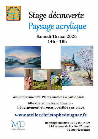 Au fil du stage, vous découvrirez comment associer structure du dessin et richesse de la peinture acrylique pour créer des paysages vivants et expressifs. L’objectif est de vous donner les bases techniques tout en vous encourageant à expérimenter avec les couleurs, la matière et la lumière afin de créer votre propre univers pictural.