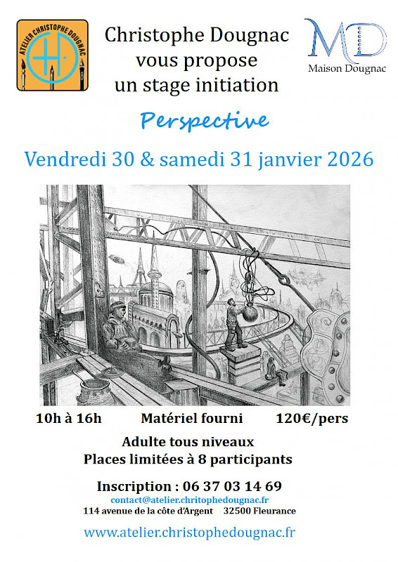 En savoir plusL'atelier Christophe Dougnac vous propose de découvrir le dessin au crayon à papier sur une après midi de 14h à 18h à Fleurance, dans le Gers. 1h30 Toulouse, 45 minutes d'Agen, 1h de Montauban, 1h30 de Tarbes. Possibilités d'hébergement sur place en chambre d'Hôtes à la Maison Dougnac.