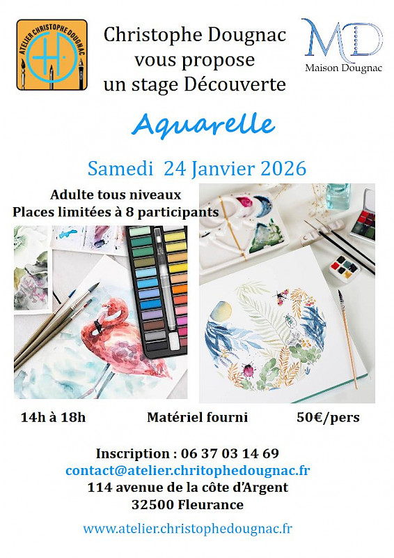 En savoir plusChristophe Dougnac peintre, auteur et créateur de mondes imaginaires vous fait découvrir l'aquarelle, dans un cadre paisible à 45 minutes d'agen, 1h de montauban et Toulouse, venez sur une après midi vous détendre en créant.
