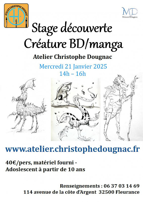 En savoir plusL'atelier Christophe Dougnac vous propose de découvrir le dessin au feutre sur une après midi de 14h à 18h à Fleurance, dans le Gers. 1h30 Toulouse, 45 minutes d'Agen, 1h de Montauban, 1h30 de Tarbes. Possibilités d'hébergement sur place en chambre d'Hôtes à la Maison Dougnac.